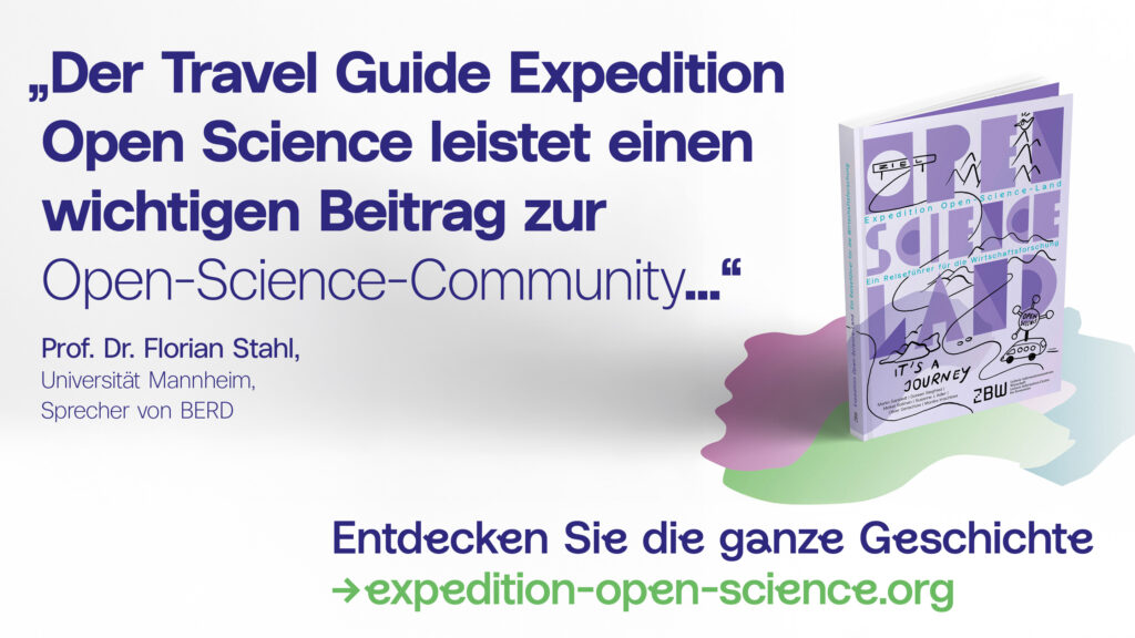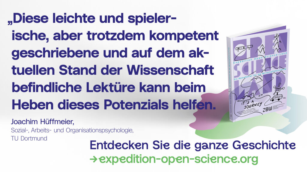 Open Science umfasst eine Vielzahl von Ansätzen, Methoden und Praktiken, was gerade für Einsteiger:innen schnell unübersichtlich wirken kann. Die Publikation „Expedition Open-Science-Land: Ein Reiseführer für die Wirtschaftsforschung“ setzt hier an. Mithilfe der Metapher einer Reise will sie BWL-Forschende dazu ermutigen, erste Schritte in Richtung Open Science zu gehen.